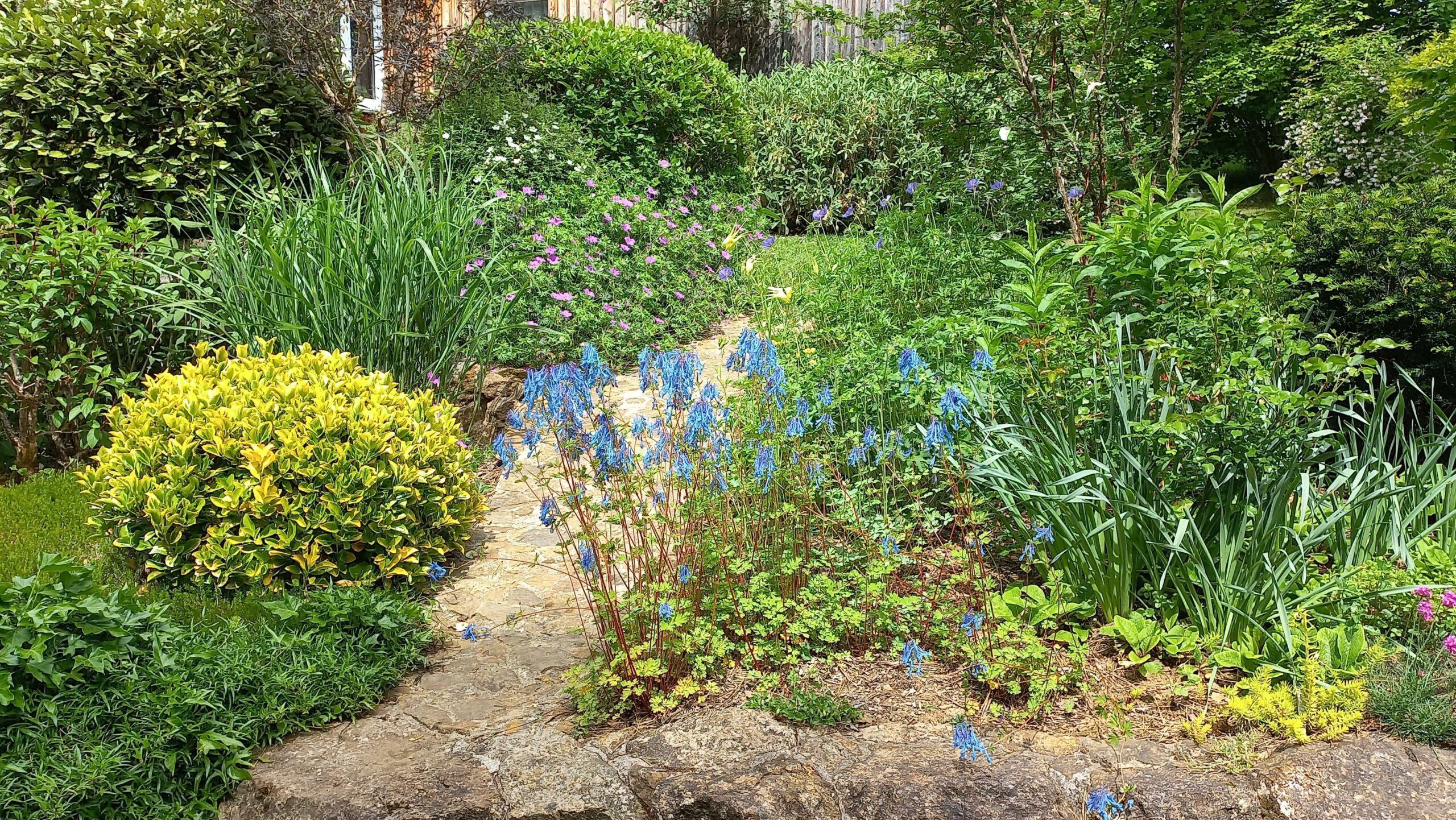 Floraison printanière de corydalis , ancolies jaunes et géraniums , pour une scène de jardin de campagne .