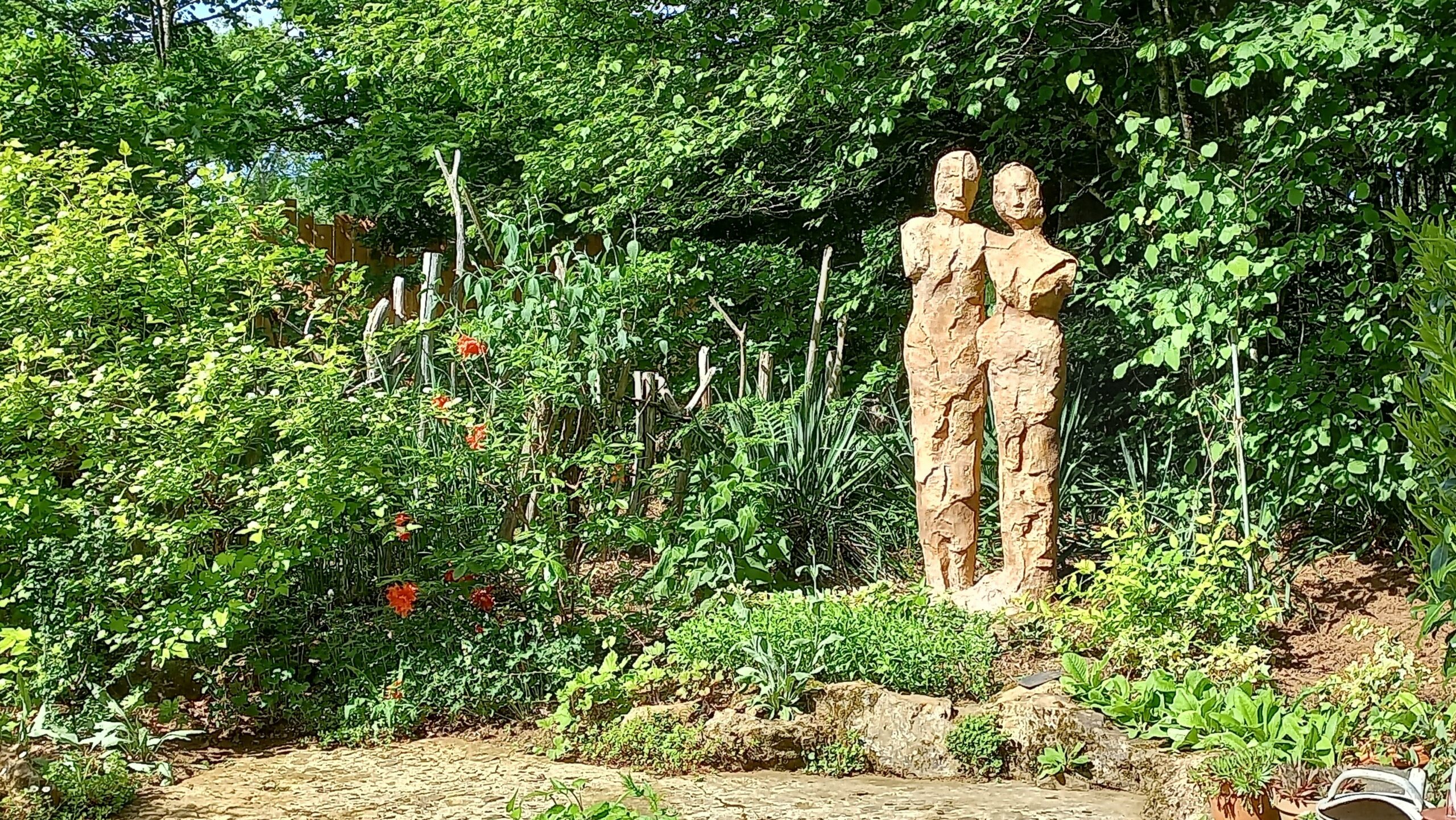 Un couple en rocaille regarde passer les visiteurs , encadré d’une végétation luxuriante .