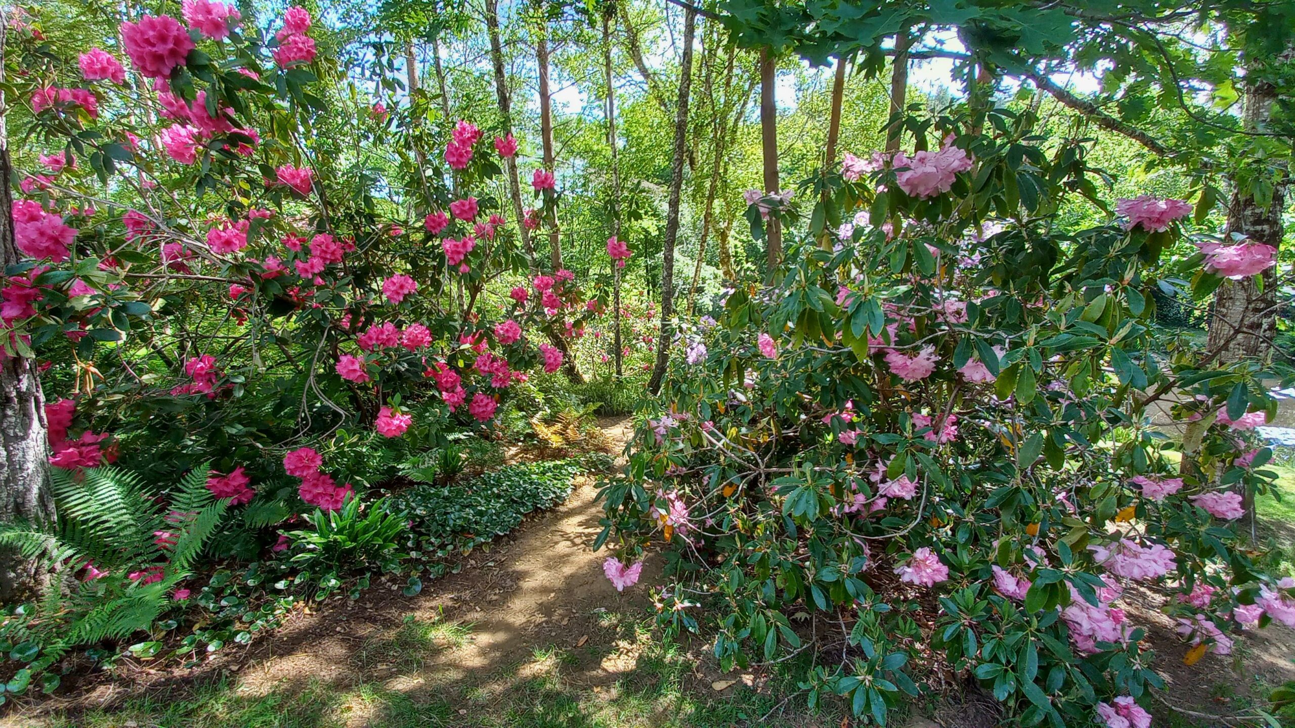 Deux rhododendrons en pleine floraison , posés sur une bordure d’asarum europaeum et de fougères