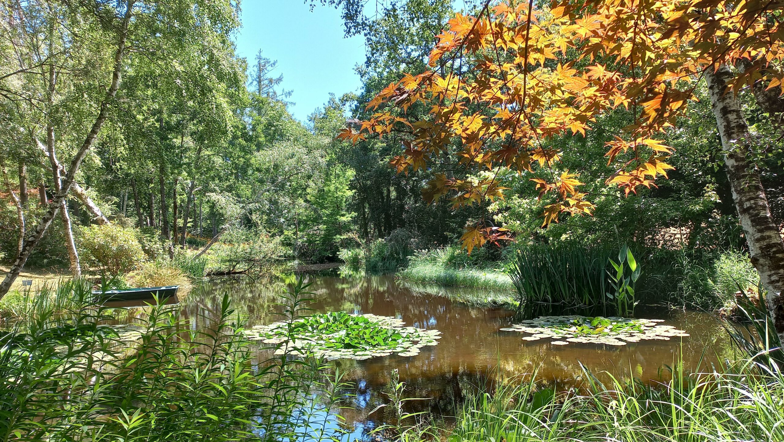 Jardin naturaliste au plan d’eau , d’où émergent nénuphars et thalias .
