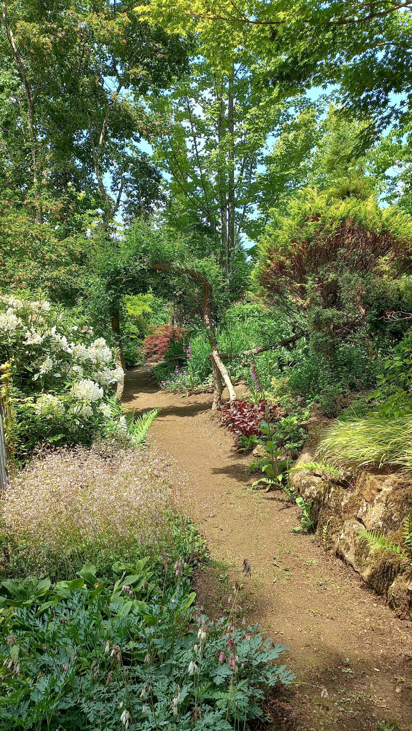 Floraison de dicentra formosa , des saxifrages et du rhododendron blanc menant vers l’arceau de rocaille aux rosiers grimpants .