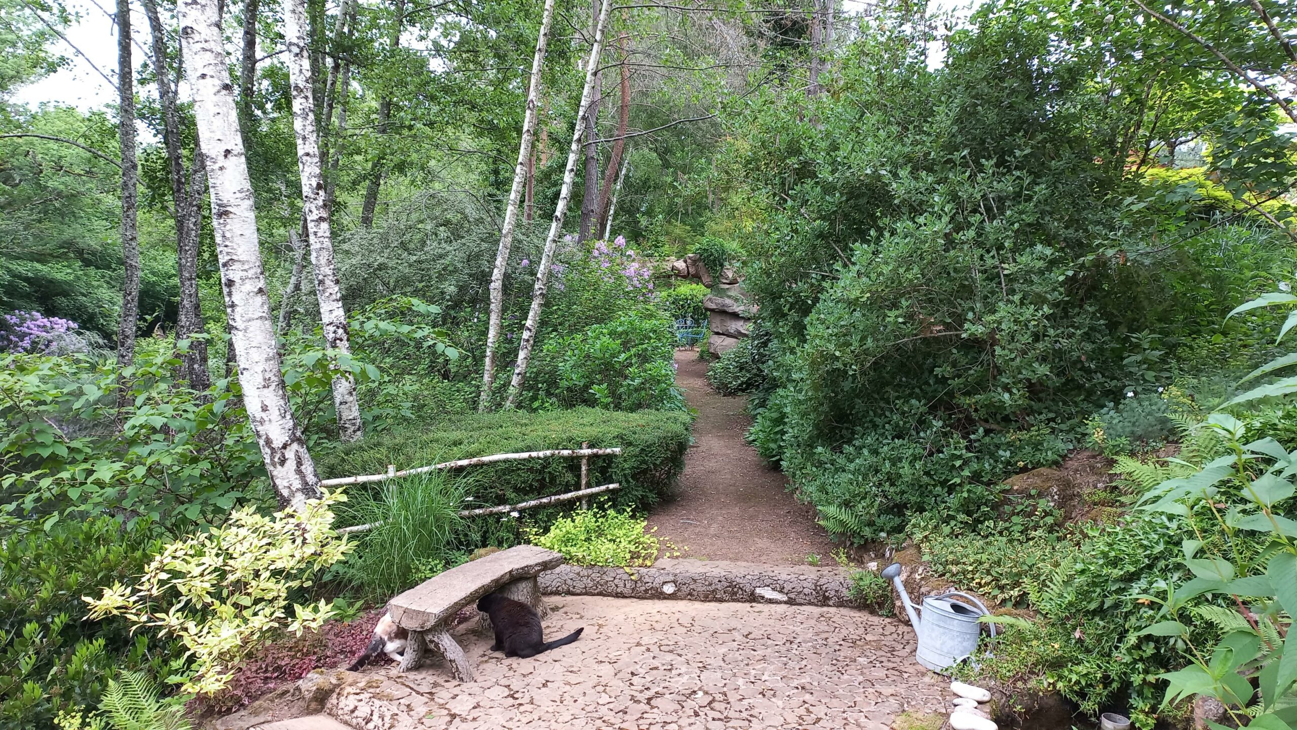 Après la petite fontaine à droite et le banc de rocaille à gauche , le cheminement passe entre un