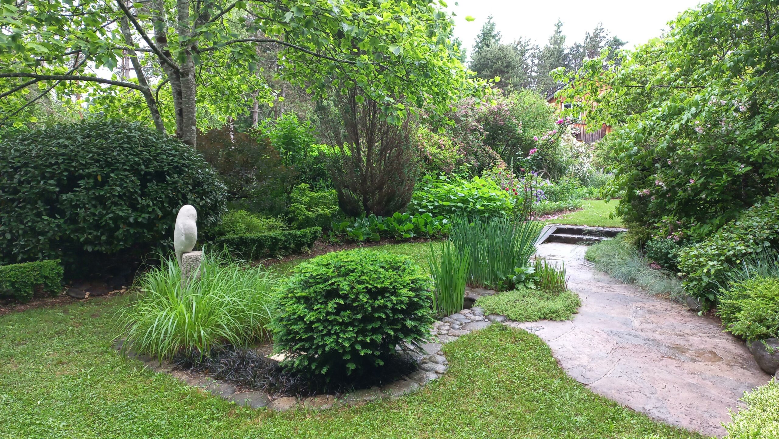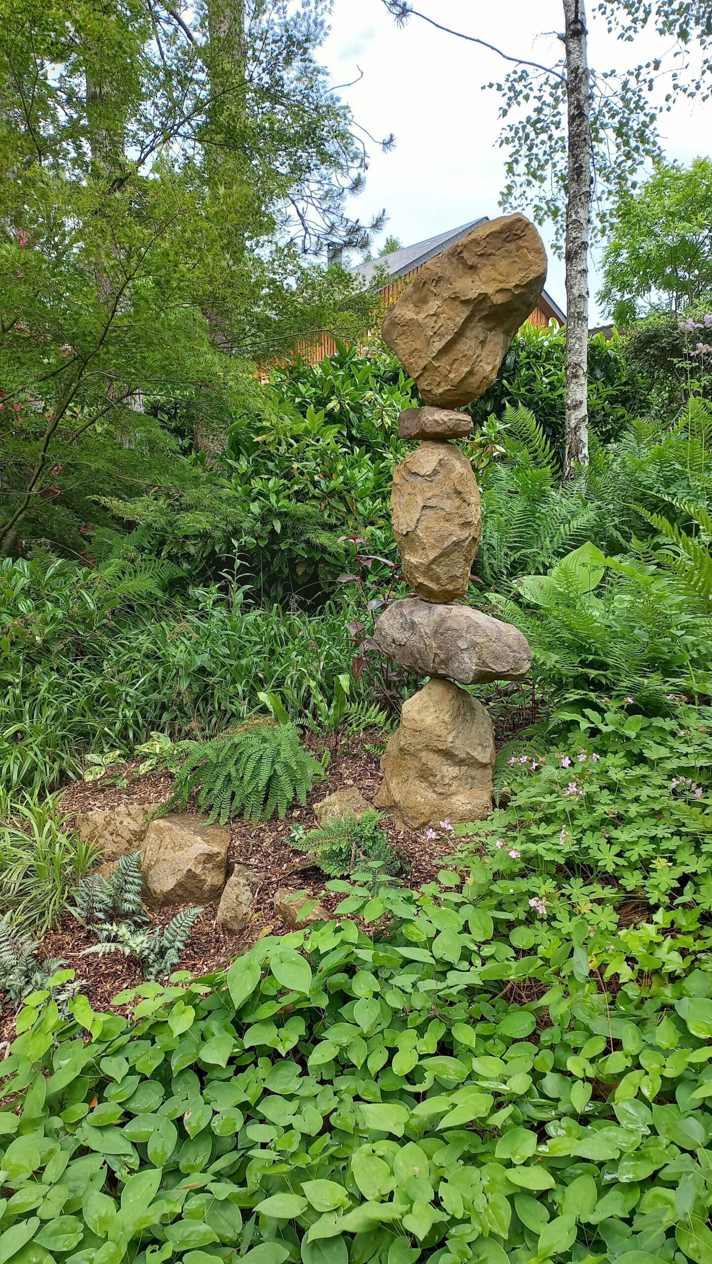 Sculpture de rocailleur surplombant des fougères de collection et des épimédiums parmi fougères