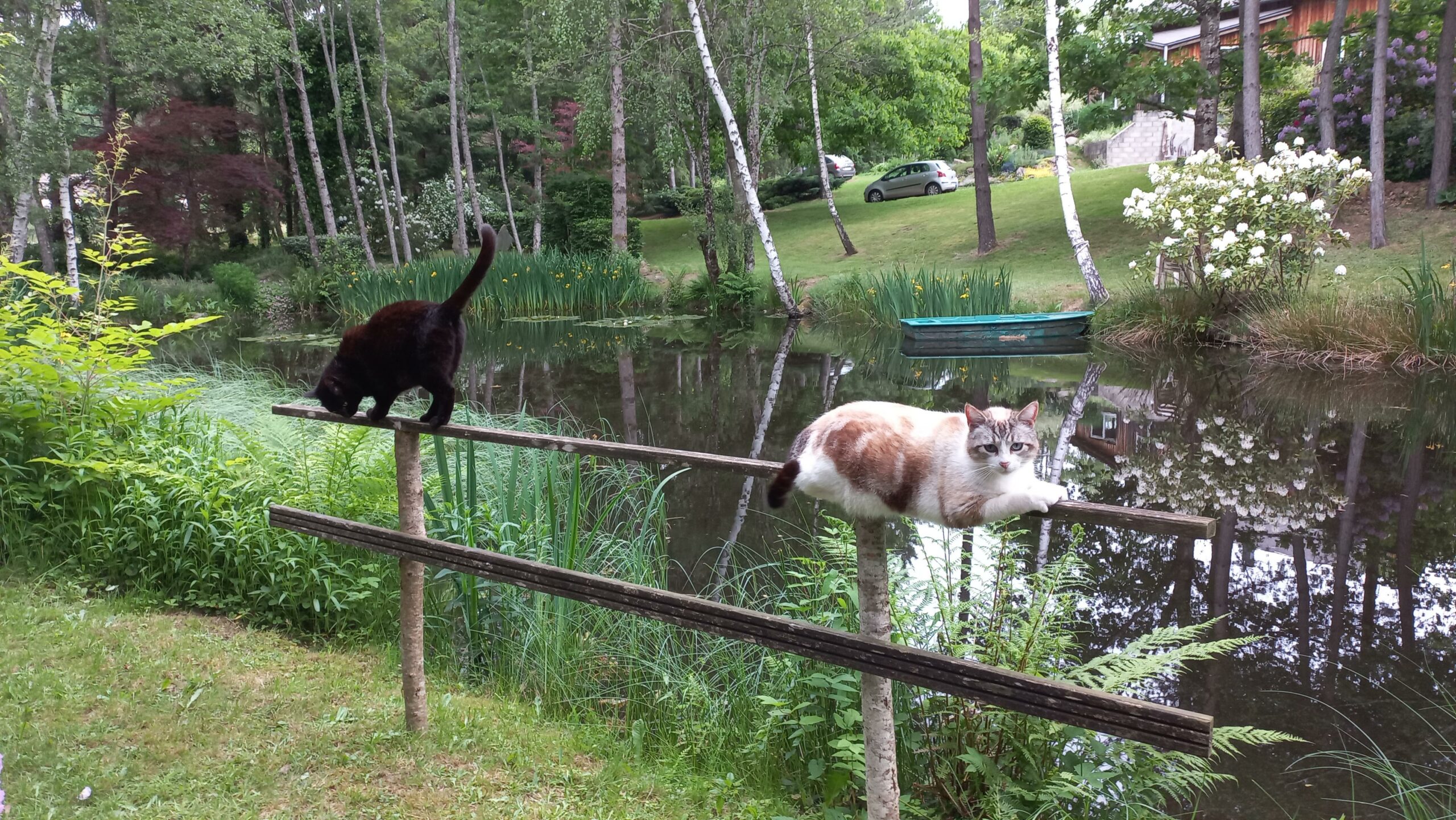 Les chats prennent la pose sur fond d’étang . Floraison des rhododendrons blancs et iris pseudacorus , jardin d’eau