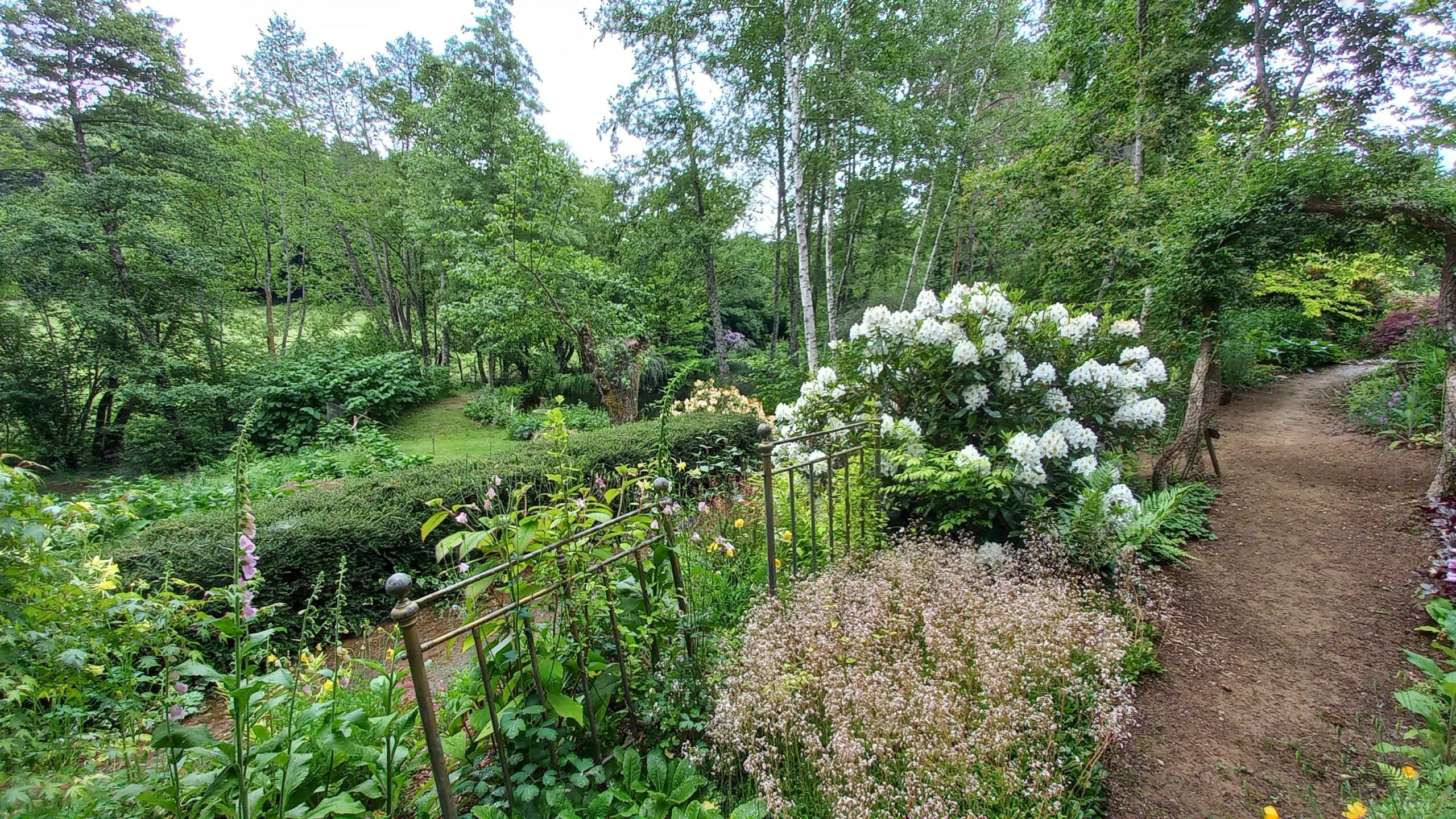 Dans le jardin à l’anglaise , floraison d’un rhododendron blanc près d’une nappe de saxifrages en fleurs . Les montants de tête de lit soutiennent des chèvrefeuilles panachés