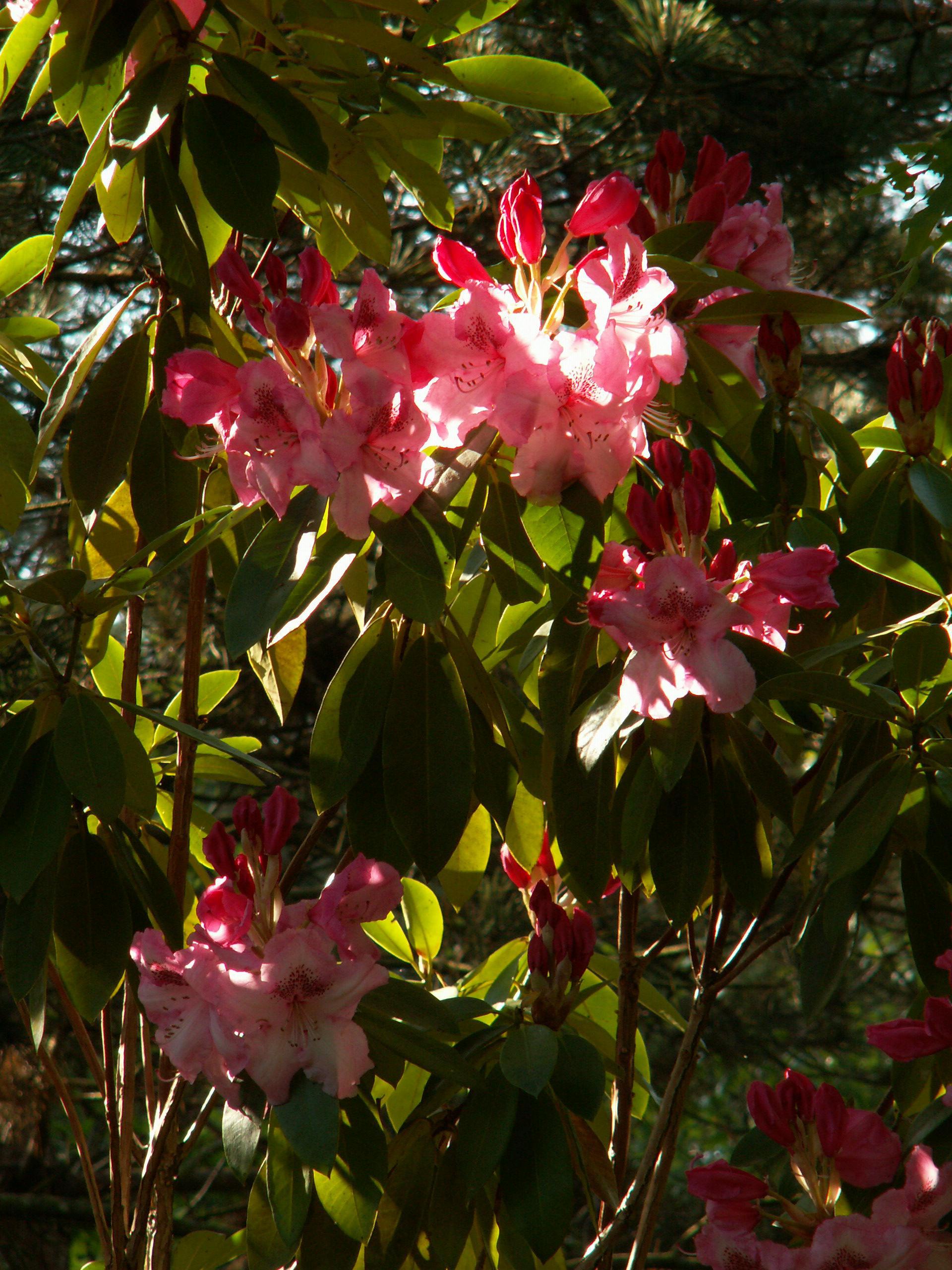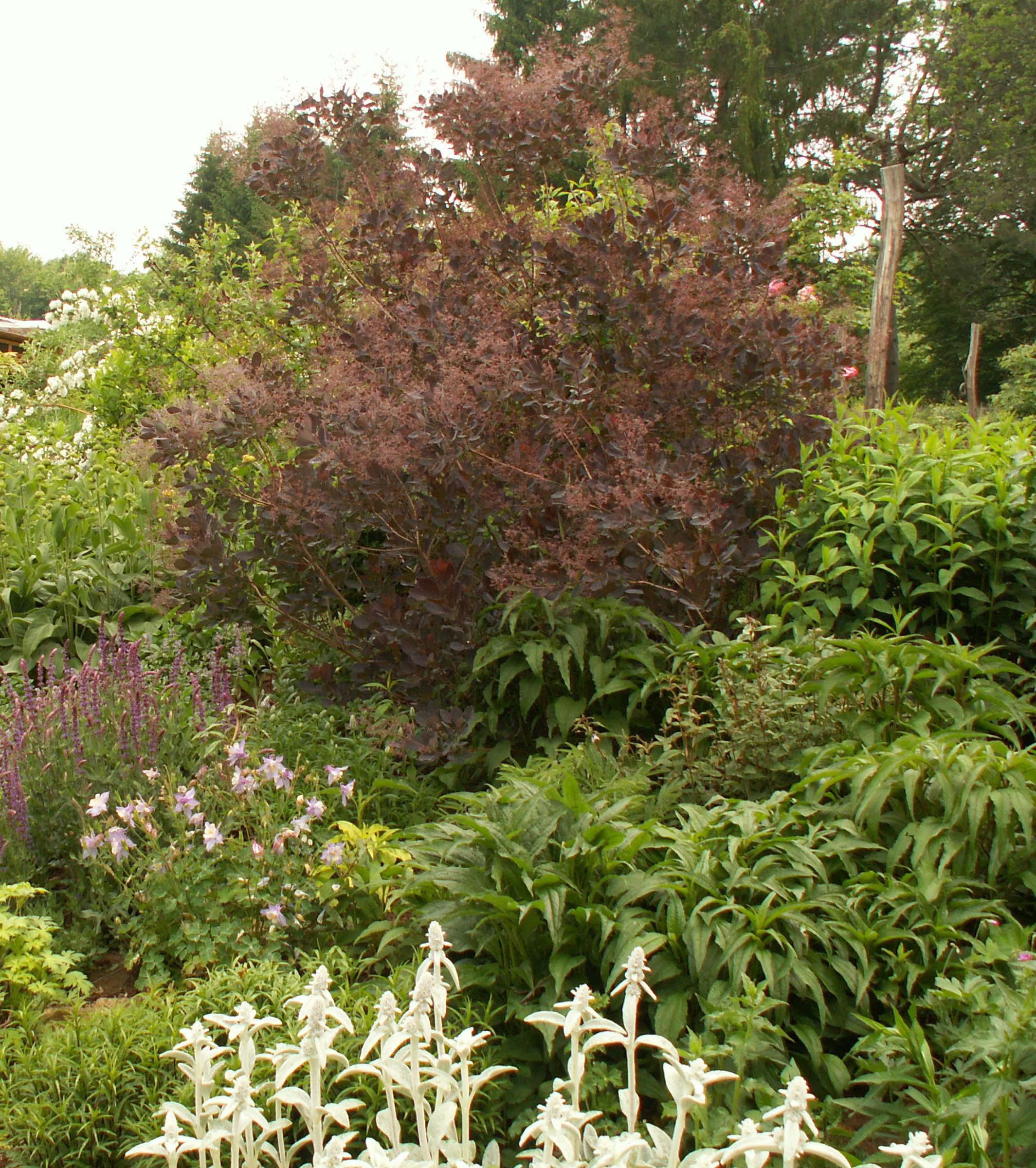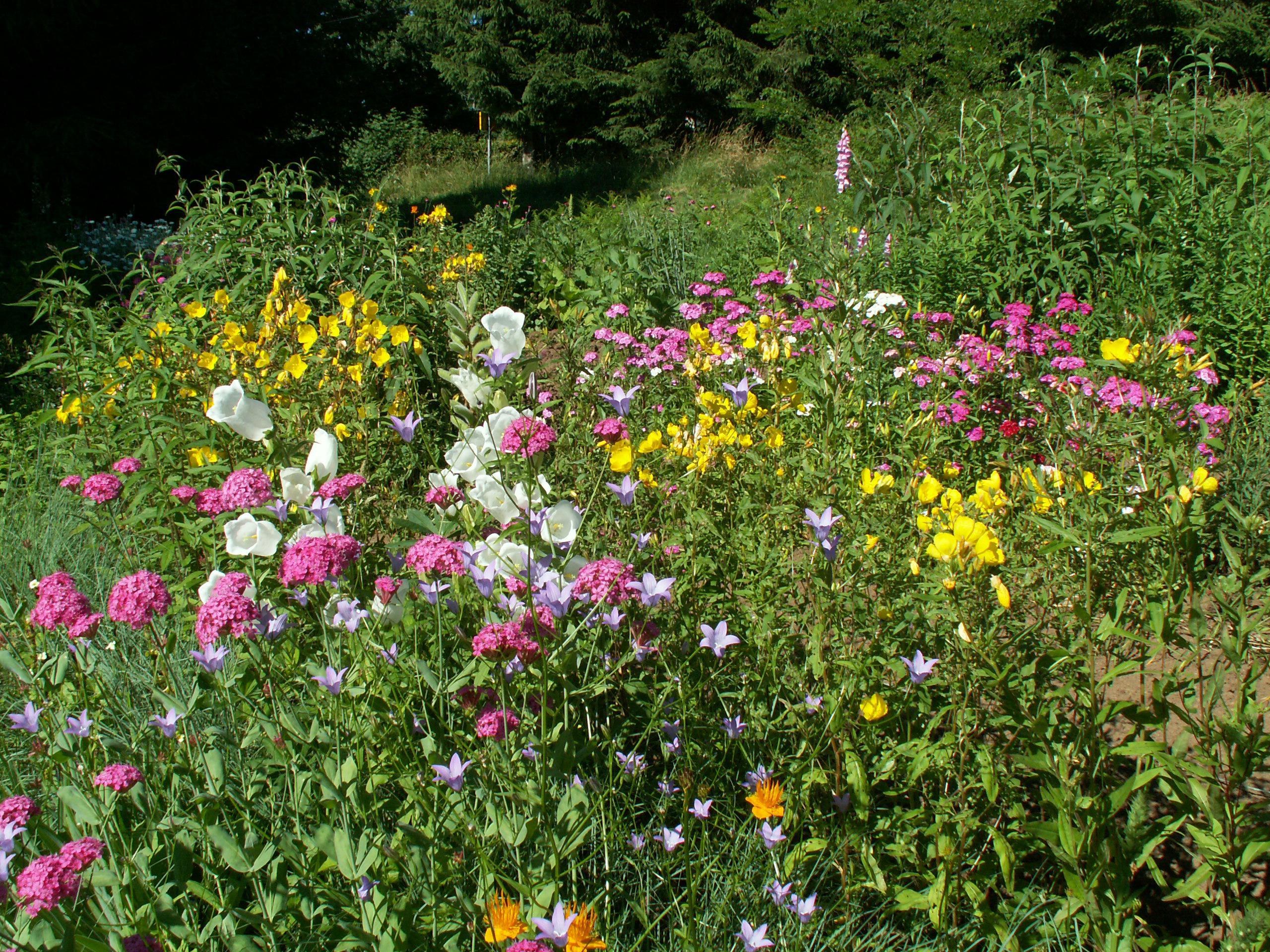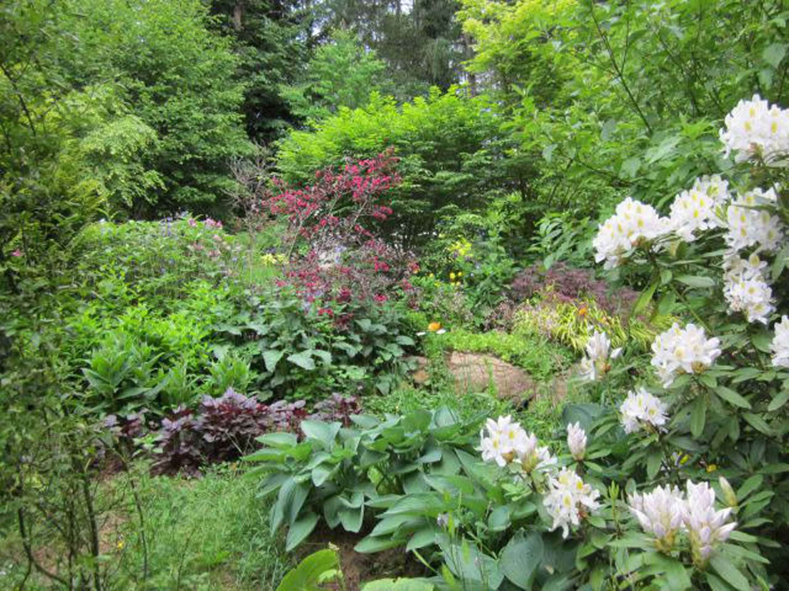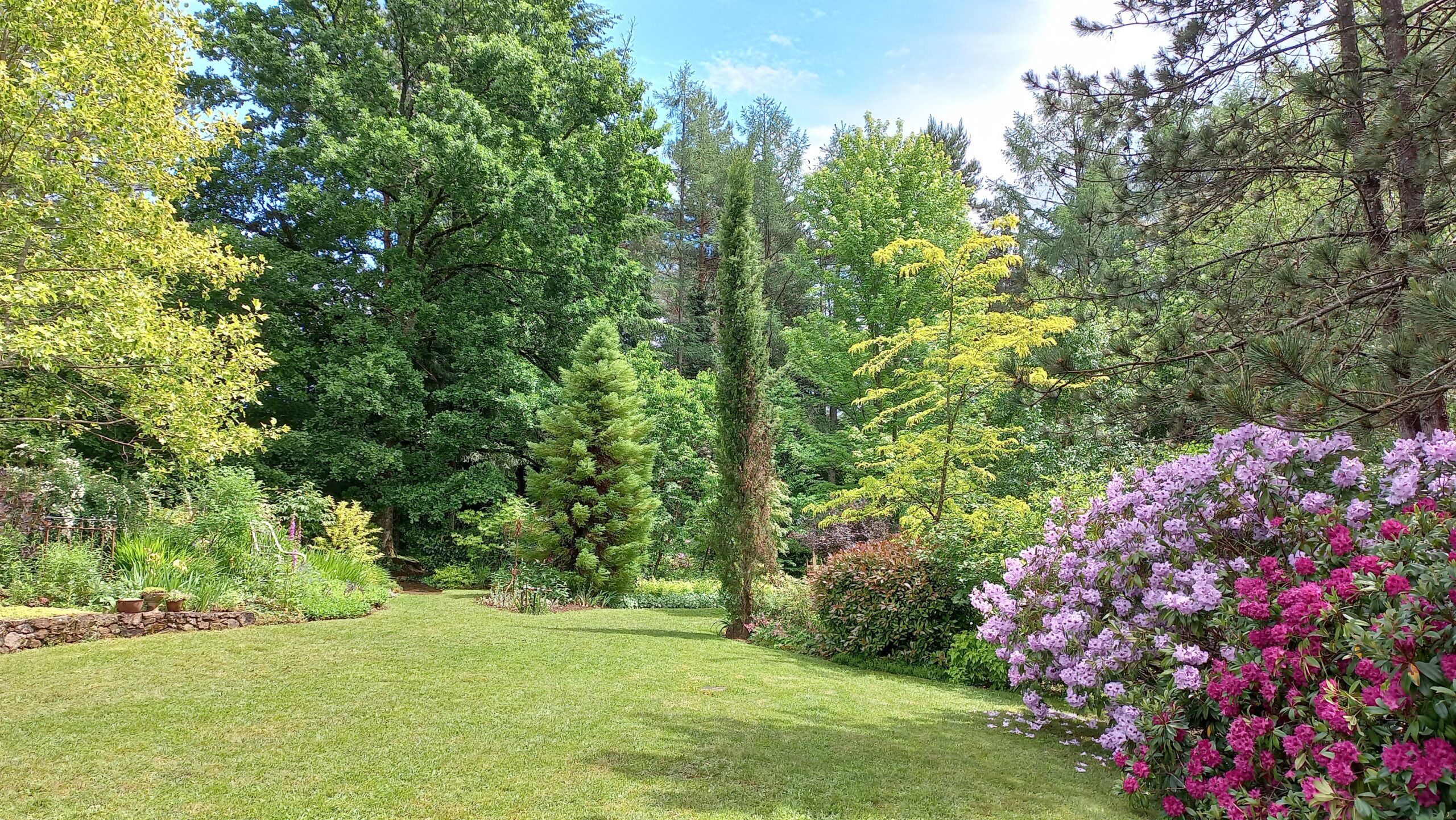Une vue d’ensemble du fond de la pelouse . La diversité des feuillages , et éclairée par l’éclat du