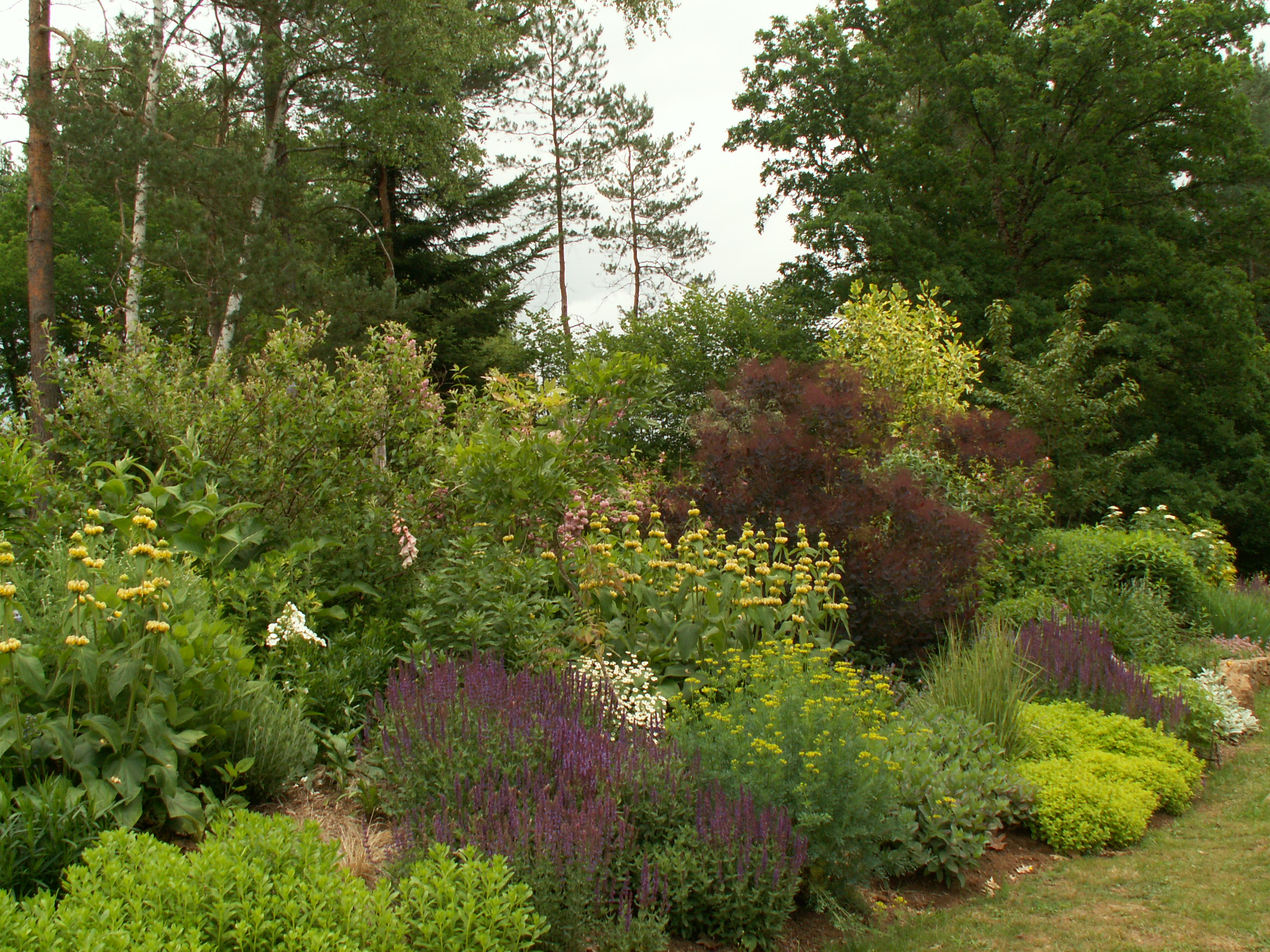 Les sauges superba répondent agréablement à la floraison jaune des phlomis.