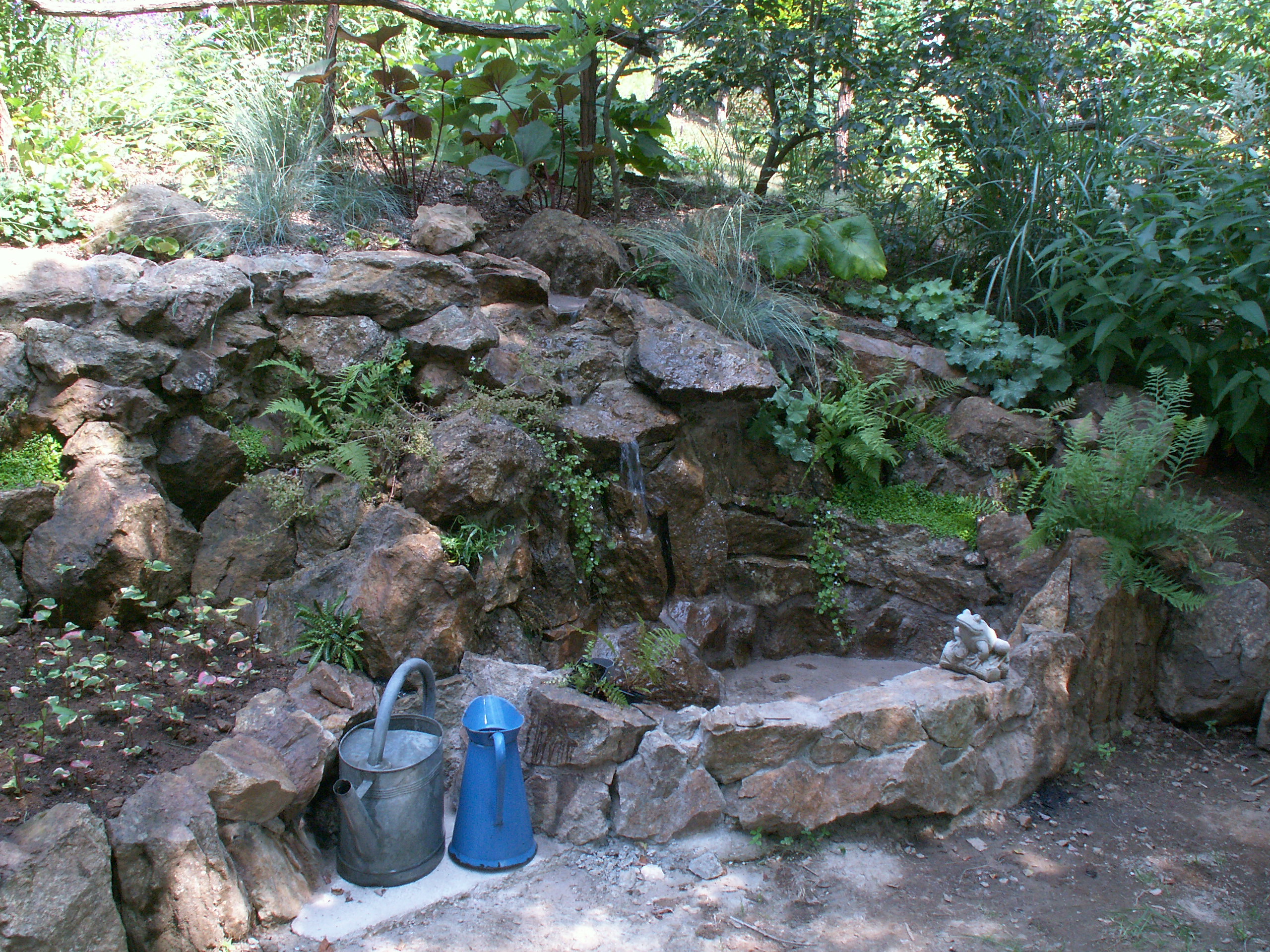 La petite fontaine terminée est en cours de remplissage.La grenouille pourra bientôt aller se baigner.