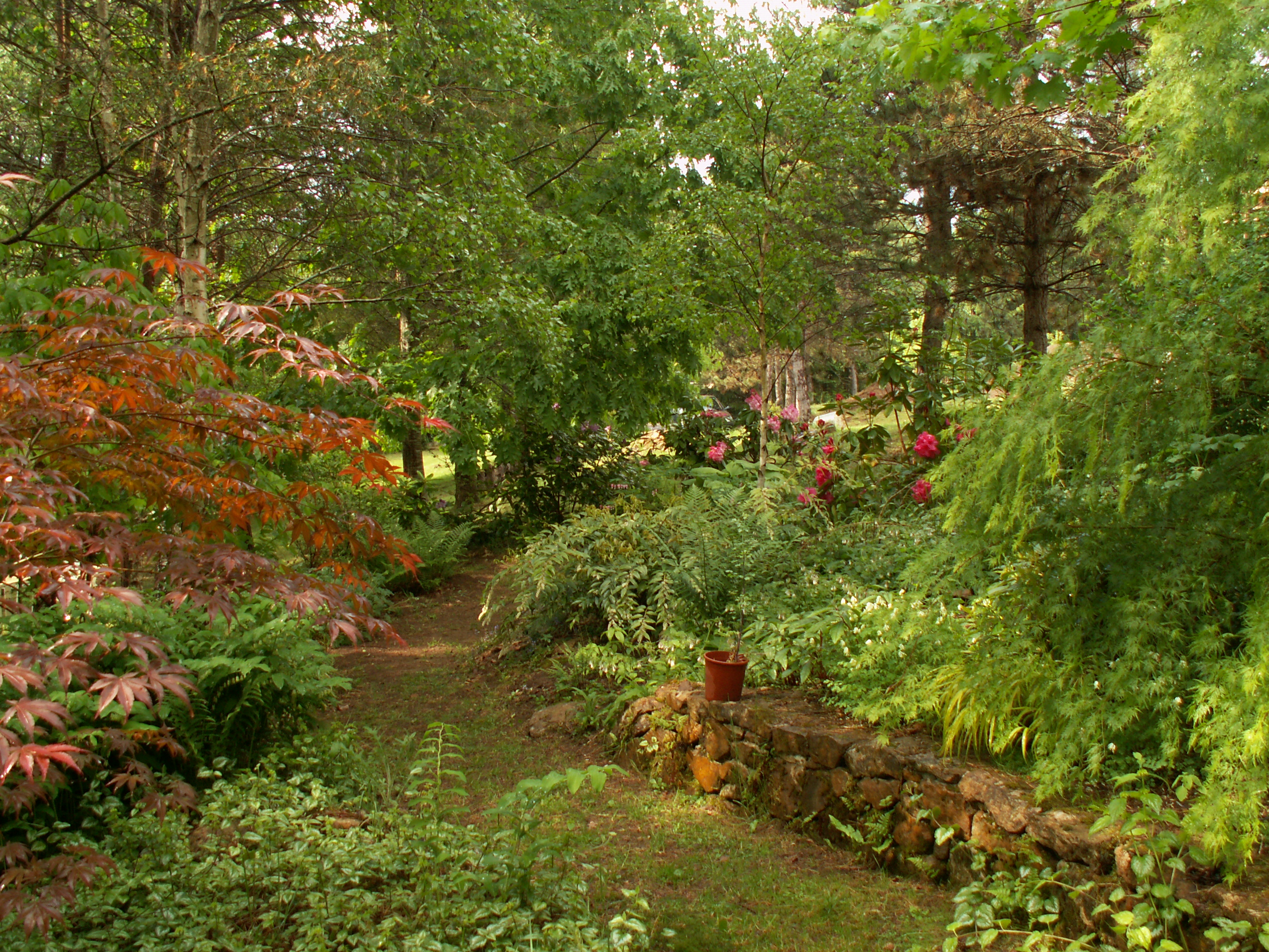 Un petit chemin qui nous mène entre d’autres érables du Japon,on aperçoit aussi la floraison de rhododendrons .