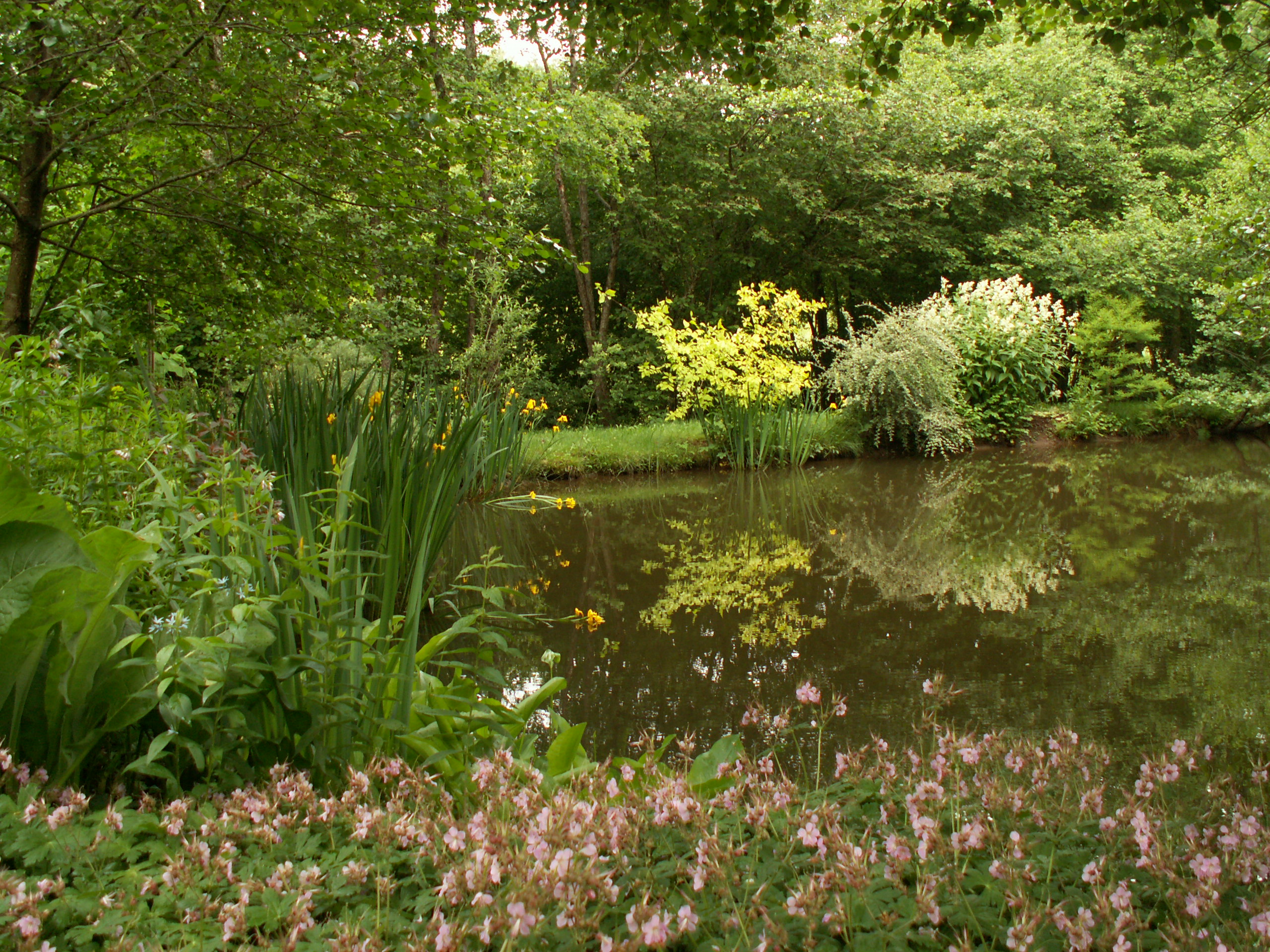 Promenade de printemps avec la floraison des iris d’eau et des géraniums macrorhizomes