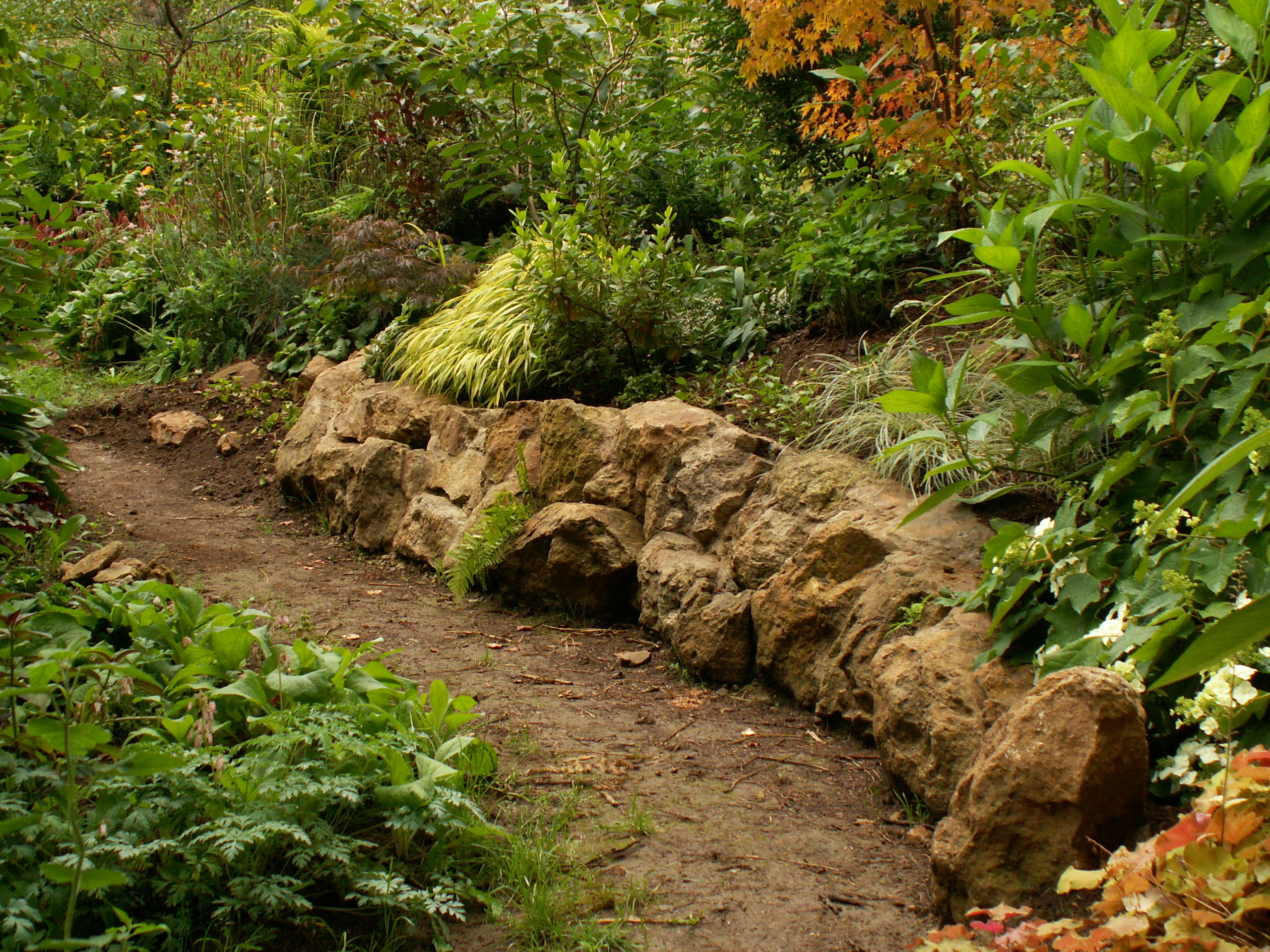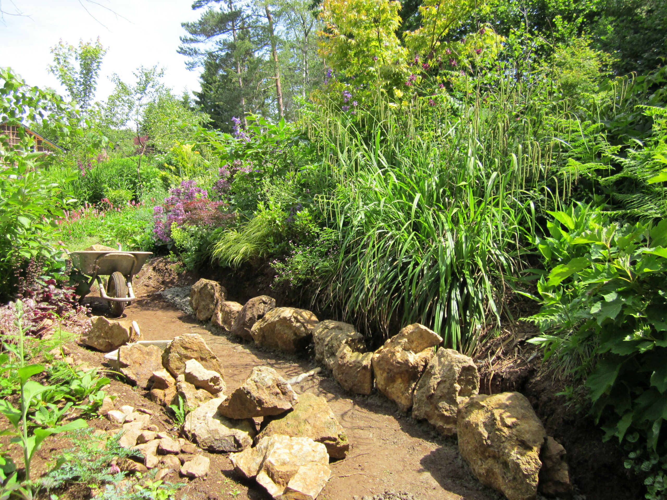 Ce mur de rochers imbriqués et cimentés vient d’être terminé, les plantations s’installent.